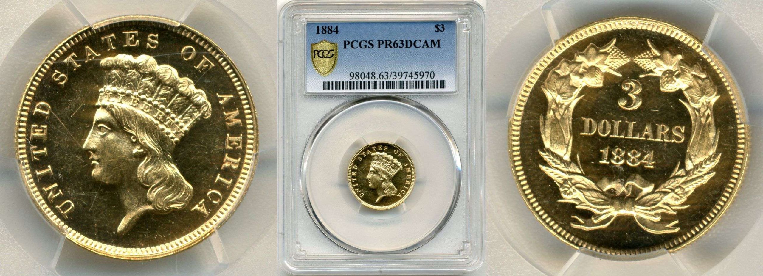 THREE DOLLAR INDIAN PRINCESS 1884 P PCGS PR 63 DEEP CAMEO